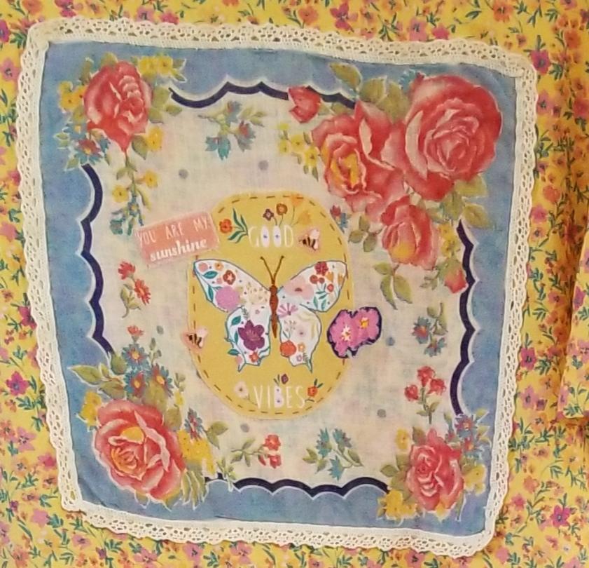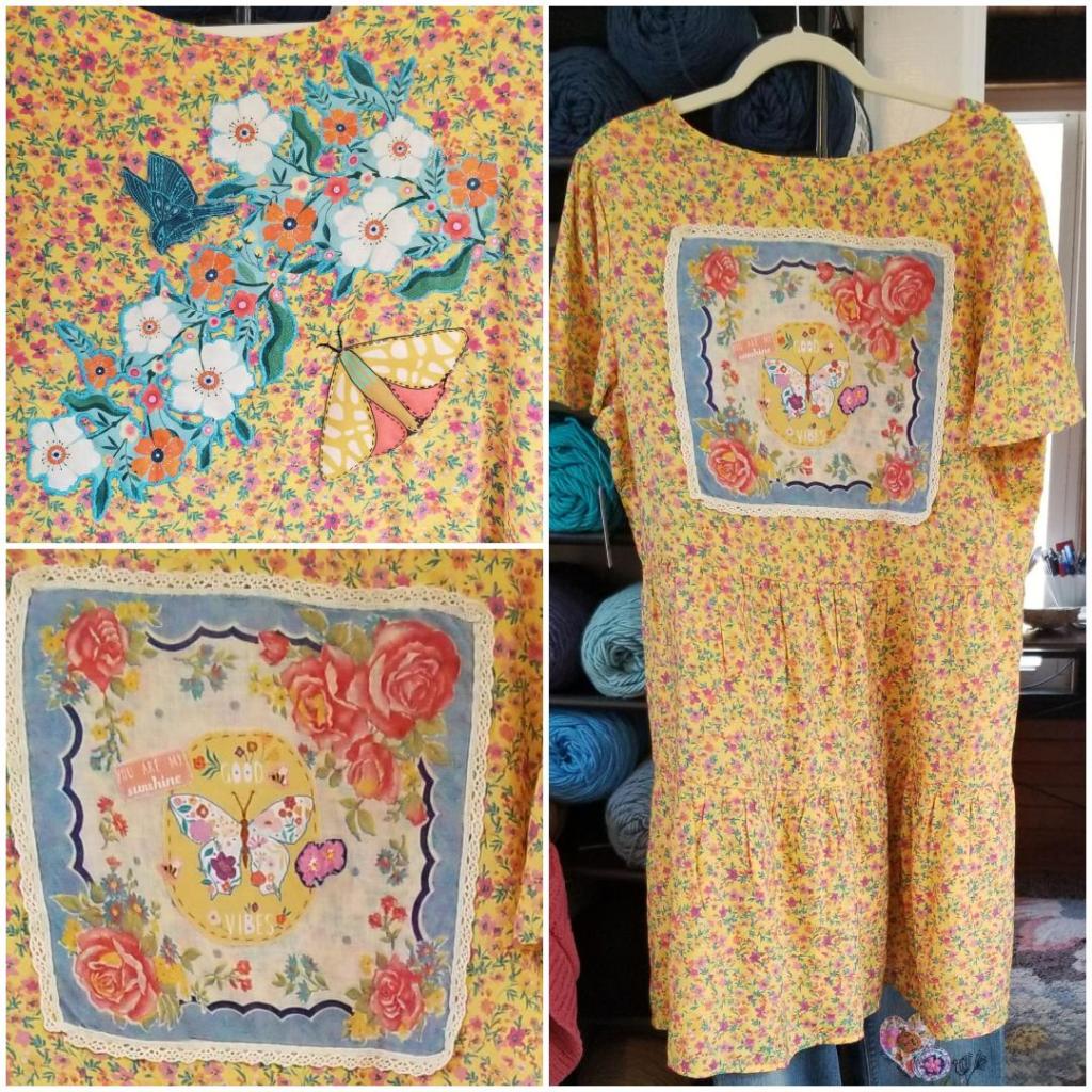 A hand appliqued humming bird and moth dance around a garland of white and orange flowers on a sweet yellow and pink floral dress. The back features a hand embellished vintage handkerchief with applique and embroidered details.
